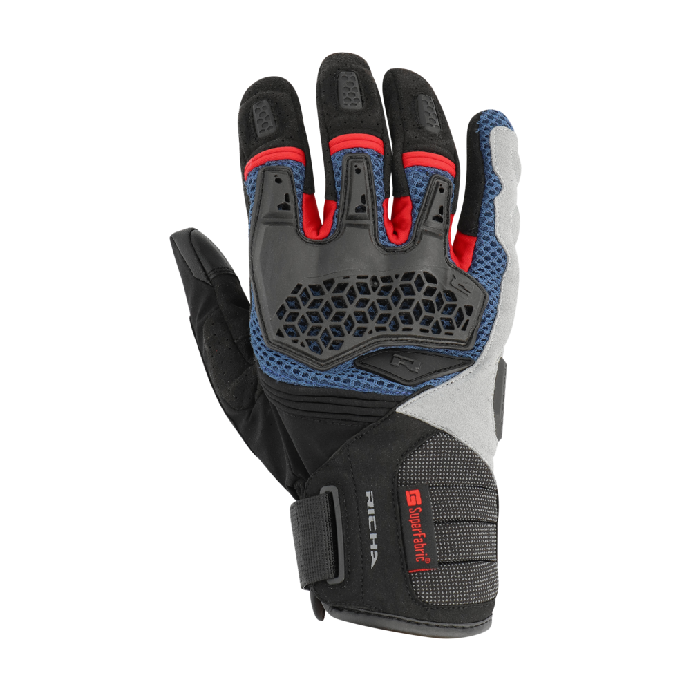 Manusi textile de vara Richa Bogota Manusile Bogota de la Richa incorporeaza o gama completa de caracteristici de siguranta, ramanand in acelasi timp usoare si confortabile pentru a fi purtate vara. Caracteristici: Invelis exterior dur, rezistent la abraziune; D3O reg; la nivelul palmelor combinata cu TPR injectat; Protectie pentru degete injectata cu TPR si protectii pentru articulatii injectate cu TPR, certificate CE; Acoperire anti-abrasie suplimentara SuperFabric, in punctele de contact, pentru protectie suplimentara in cazul contactului cu soseaua; Cusatura box pentru o protectie mai buna si confort fara cusaturi; Intindere in acordeon intre degete si panou elastic interior pentru degetul mare pentru o potrivire imbunatatita; Ventilatie AVS in punct fix, impreuna cu panouri perforate din piele si ventilatie pentru degete pentru flux de aer si respirabilitate imbunatatite; Curea ce ajuta la punerea manusilor pe maini, plus inchizatori Velcro pentru incheieturi pentru o potrivire imbunatatita; Degetele sunt compatibile cu ecranele tactile; Concepute pentru vara.