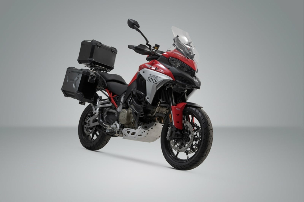 Setul de cutii Adventure include suportul lateral PRO potrivit si suportul corespunzator ADVENTURE-RACK. Aceste componente se fixeaza la punctele de atasare specifice fiecarei motociclete, oferind suport solid pentru cutiile din aluminiu TRAX ADV. Acest set reprezinta o solutie completa si lipsita de griji pentru orice calatorie. Cu cutia premium din aluminiu TRAX ADV rezistenta la apa si praf, doua cutii laterale si o cutie de bagaj, bagajele beneficiaza de cea mai buna protectie posibila. Dezvoltarea specifica fiecarei motociclete a suportului lateral PRO detasabil si a ADVENTURE-RACK asigura o potrivire optima si o prindere sigura pentru cutiile din aluminiu. Cutiile robuste din aluminiu TRAX ADV impresioneaza prin stabilitatea lor, impermeabilitatea la apa si praf, aspectul elegant, caracteristicile bine gandite si gama larga de accesorii disponibile. Pentru mai mult spatiu de depozitare, acest set Adventure include doua genti de extensie TRAX M L, care se fixeaza pe cutiile laterale si sunt rezistente la apa, permitand accesul rapid la continut. Pachetul include: 1 x TRAX ADV Top case, 38,00 l 1 x TRAX ADV L Aluminium case, 45,00 l, stanga 1 x TRAX ADV L Aluminium case, 45,00 l, dreapta 2 x Suport lateral PRO 2 x Adaptoare pentru suportii laterali 2 x Protectie antifurt pentru suportii lateral 1 x Suport top-case Adventure Rack 1 x Adaptoare pentru suportul Adventure Rack 3 x Seturi de chei Trax 2 x Genti TRAX WP M L 6 x Limitatoare de capac 3 x Genti interne 1 x Unelte multiple Instructiuni de montaj Material de montaj
