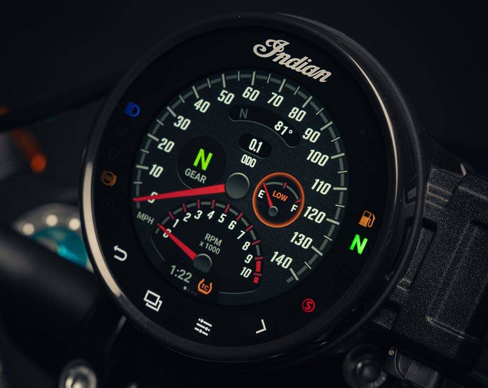 INFOTAINMENT 4 in Touchscreen powered by RIDE COMMAND. Touchscreen display includes real-time clock; ambient air temperature; heading; audio information display; map/navigation; Bluetooth status for phone and headset; vehicle status (voltage, engine hours, oil change); vehicle info (speed, fuel range, RPM, gear position); current ride data (distance, moving time, stop time, altitude, altitude change); trip meters; ride mode selection; screen brightness; and vehicle trouble code readout.